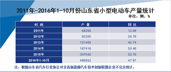 小型電動(dòng)汽車產(chǎn)業(yè)在市場(chǎng)需求的拉動(dòng)和政策有力支持下,產(chǎn)銷呈現(xiàn)快速發(fā)展的良好態(tài)勢(shì)。山東省汽車行業(yè)協(xié)會(huì)常務(wù)副會(huì)長(zhǎng)兼秘書(shū)長(zhǎng)魏學(xué)勤在此次高峰論壇發(fā)言中表示,山東省小型電動(dòng)汽車產(chǎn)量已經(jīng)連續(xù)三年平均增長(zhǎng)達(dá)到50%,2016年1-10月山東省小型電動(dòng)汽車產(chǎn)量為469852輛。